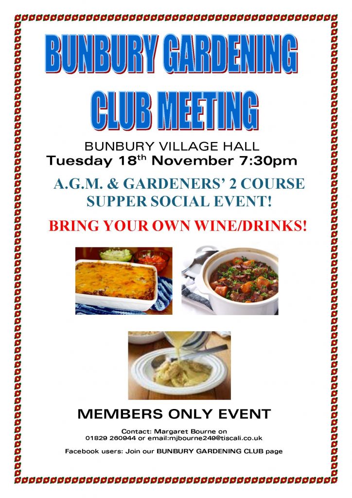 Will hold their Annual AGM for club members only in BUNBURY VILLAGE HALL on TUESDAY 18th NOVEMBER at 7:30pm.