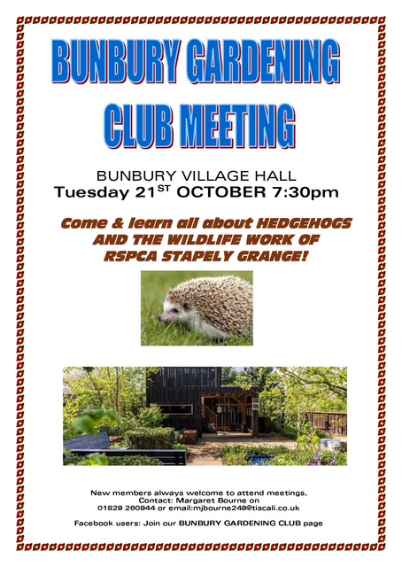 Talk on 21st October at 7.30 by RSPCA Stapeley Grange on Hedgehogs and their work with wildlife.